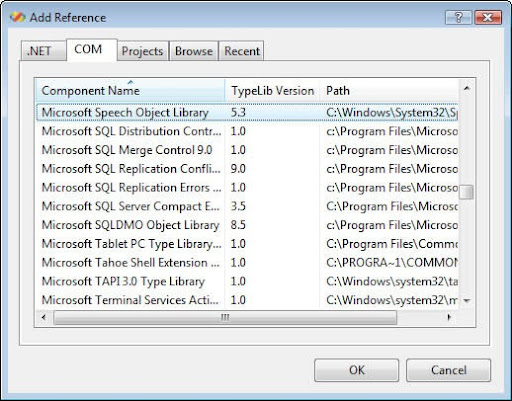 2. Agregar una referencia al SAPI; hay que dar click derecho en el icono del proyecto->add reference-> luego en la pestaña de COM y luego seleccionar "Microsoft Speech Object Library".